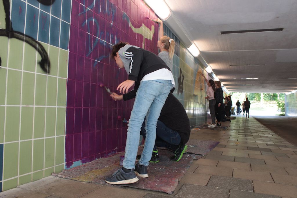 Die Schüler*innen freuten sich über die Gelegenheit, mit Spraydosen und Lackstiften zu arbeiten und machten sich mit viel Freude und Elan ans Werk. Der dem Projekt zugrundeliegende Gedanke war, ihnen die Möglichkeit zu geben, den Schulweg nach eigenen Vorstellungen zu verschönern und damit ihre unmittelbare Umwelt aufzuwerten. Diese Idee ist gut aufgegangen, jeden Tag können sie sich auf dem Weg in die Schule an ihrem gemeinsamen Werk freuen – und alle anderen Mitbürger, die die Unterführung nehmen, ebenfalls.